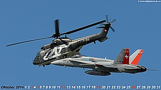 Kalenderblatt Oktober 2014 AS 332 M-1 Super Puma und F/A-18 Hornet der Schweizer Luftwaffe